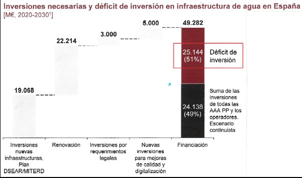 Desde hace años, el sector del agua urbana viene reclamando la urgencia de realizar un esfuerzo inversor sostenido en infraestructuras del ciclo urbano del agua, ya que, actualmente la media anual de inversión real no alcanza el 50% de lo necesario. En ese sentido, el agua urbana necesita una inversión anual de 2.500 M€ adicionales, hasta los 4.900 M€, para garantizar la calidad, la sostenibilidad de los servicios y afrontar los retos futuros como el cambio climático o los más exigentes requerimientos regulatorios en materia de calidad del agua, potabilización, depuración y reutilización.