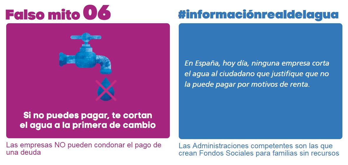 Cartel Falso mito 06, Si no puedes pagar, te cortan el agua a la primera de cambio.Las empresas No pueden condonar el pago de una deuda.Cartel  #información real del agua,En España, hoy día ninguna empresa corta el agua al ciudadano que justifique que no la puede pagar por motivos de renta.