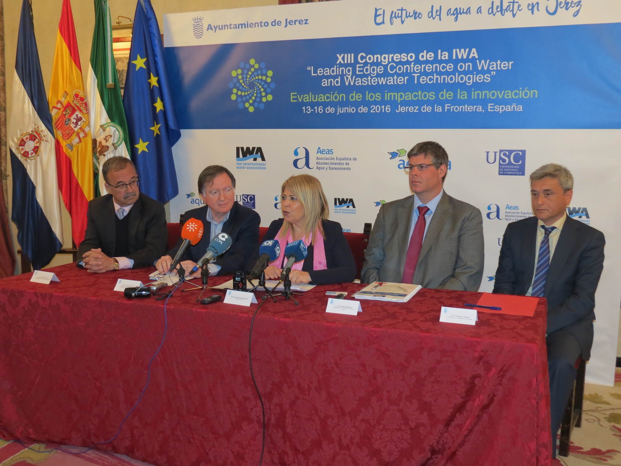 La alcaldesa de Jerez, Mamen Sánchez, ha presidido hoy la rueda de prensa de presentación oficial de la decimotercera edición del IWA Leading Edge Conference,  congreso mundial que albergará la ciudad del 13 al 16 de junio bajo el lema “Evaluando los impactos de la innovación”.
