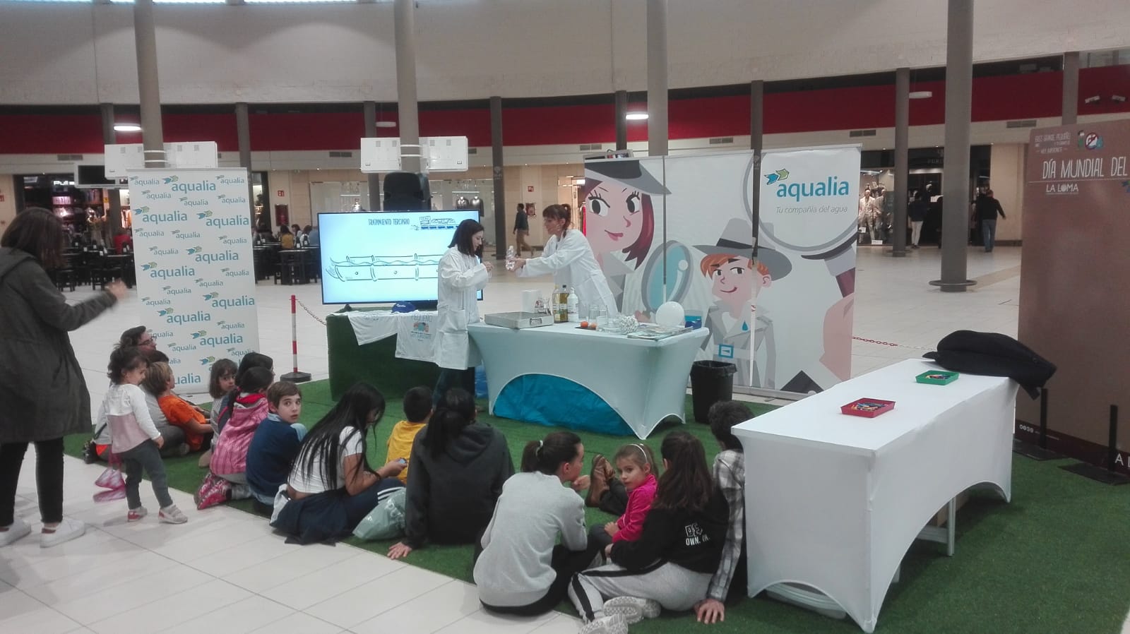 Ambas entidades han colaborado por segundo año conmemorando el Día Mundial del Agua con esta iniciativa para enseñarles de manera divertida la importancia del agua, su uso responsable, o las propiedades físico-químicas del elemento. A través de vídeos educativos adaptados a su edad, experimentos, cómics, dibujos para colorear, etc los pequeños han pasado un divertido rato ejerciendo de “investigadores del agua” en el centro comercial.