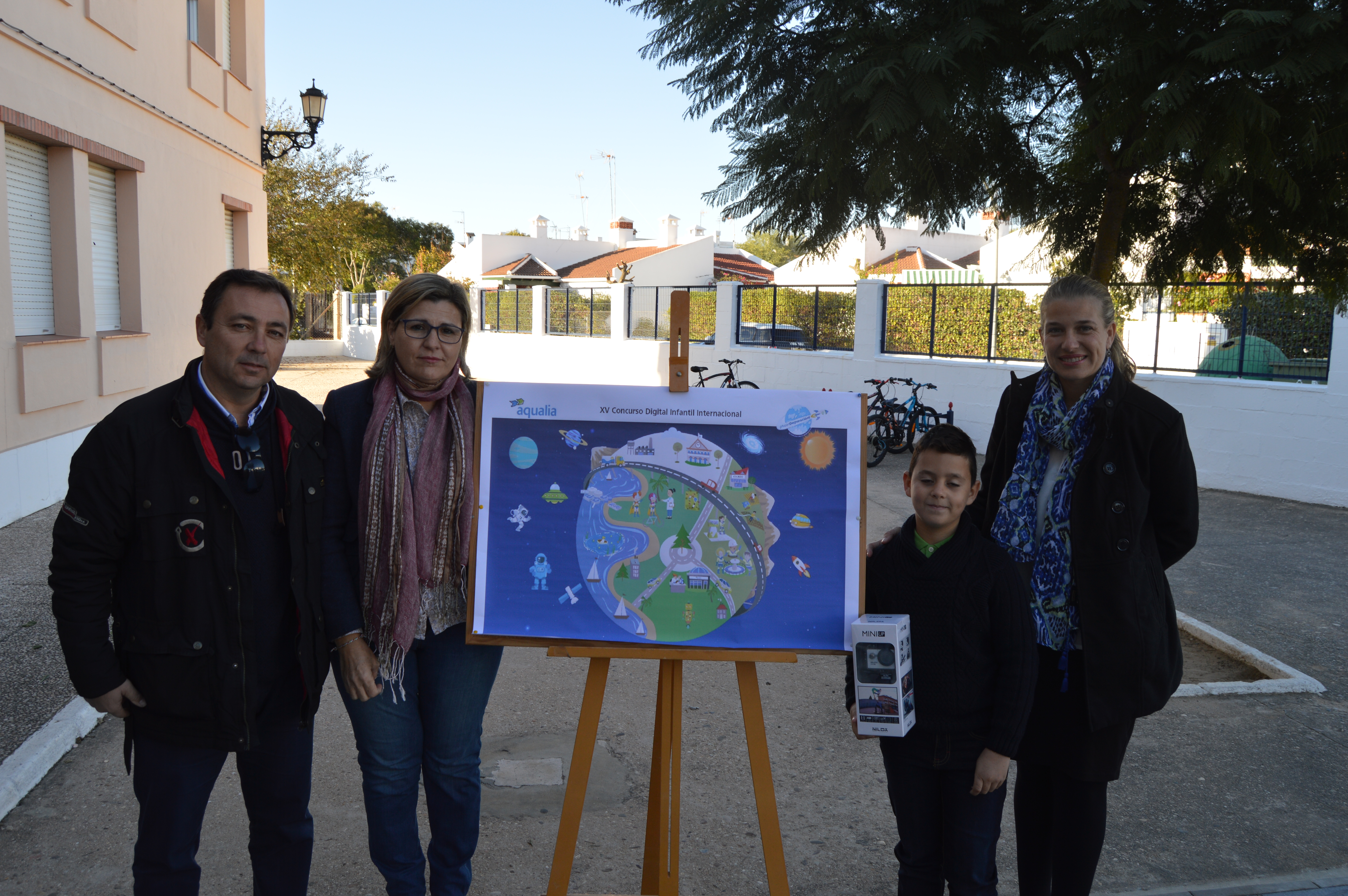 Daniel, ha recibido en el Colegio, rodeado por sus compañeros, como premio, una cámara de fotos acuática, que le ha entregado personalmente Mª Rocío de la Torre, Concejala de Relaciones Vecinales de Matalascañas, junto a Juan Carlos Benítez, jefe de servicio de Aqualia en el municipio.